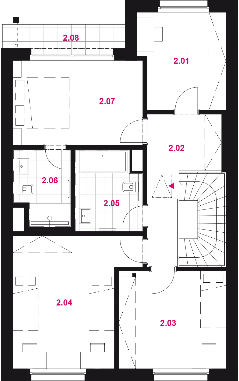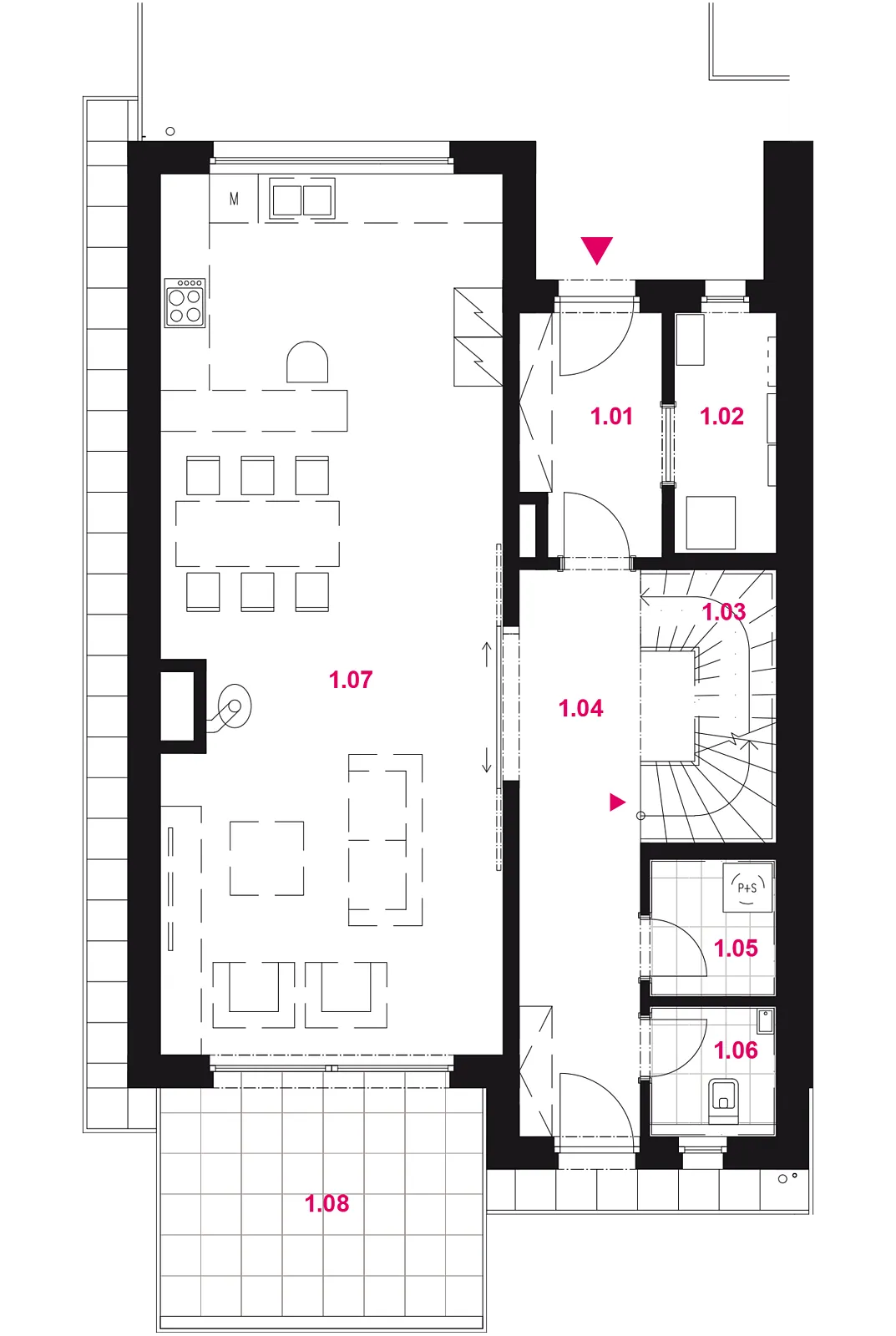 ** Plochy jednotlivých místností jsou pouze orientační. Vyobrazené zařízení v plánech domů (nábytek, kuch. linka, spotřebiče atd.) není součástí dodávky. Rozsah dodávky je specifikován ve standardu a finálně pak ve smlouvě. Grafické schéma je pouze ilustrativní.