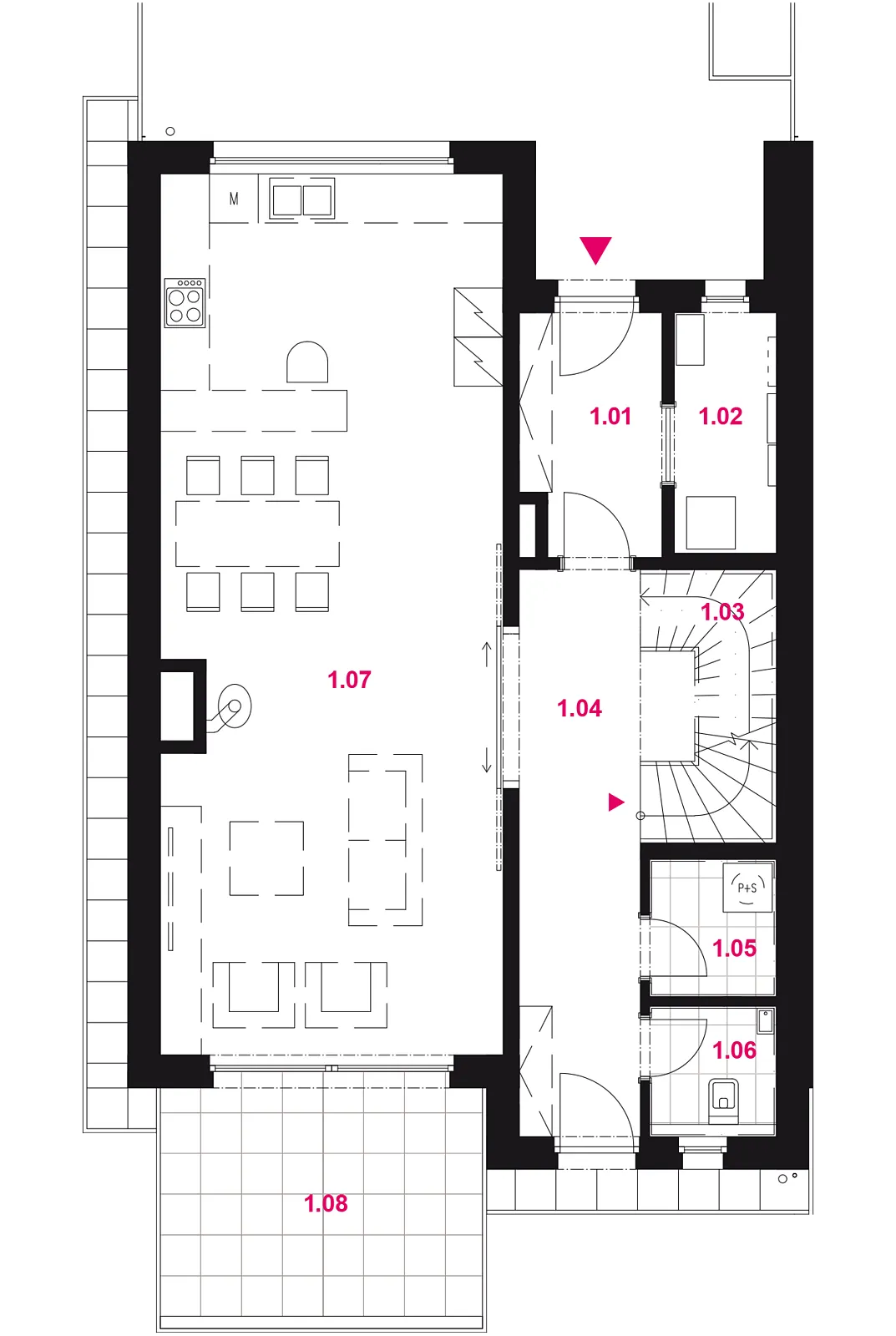 ** Plochy jednotlivých místností jsou pouze orientační. Vyobrazené zařízení v plánech domů (nábytek, kuch. linka, spotřebiče atd.) není součástí dodávky. Rozsah dodávky je specifikován ve standardu a finálně pak ve smlouvě. Grafické schéma je pouze ilustrativní.