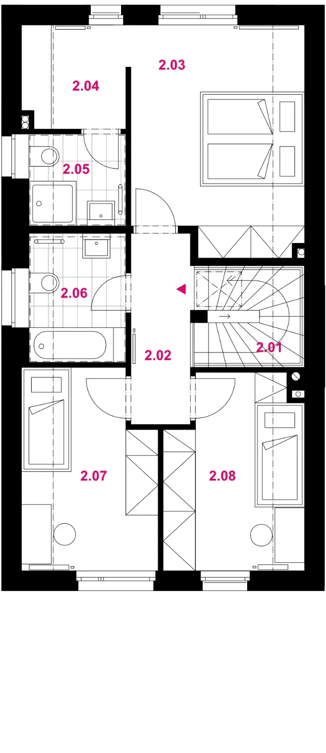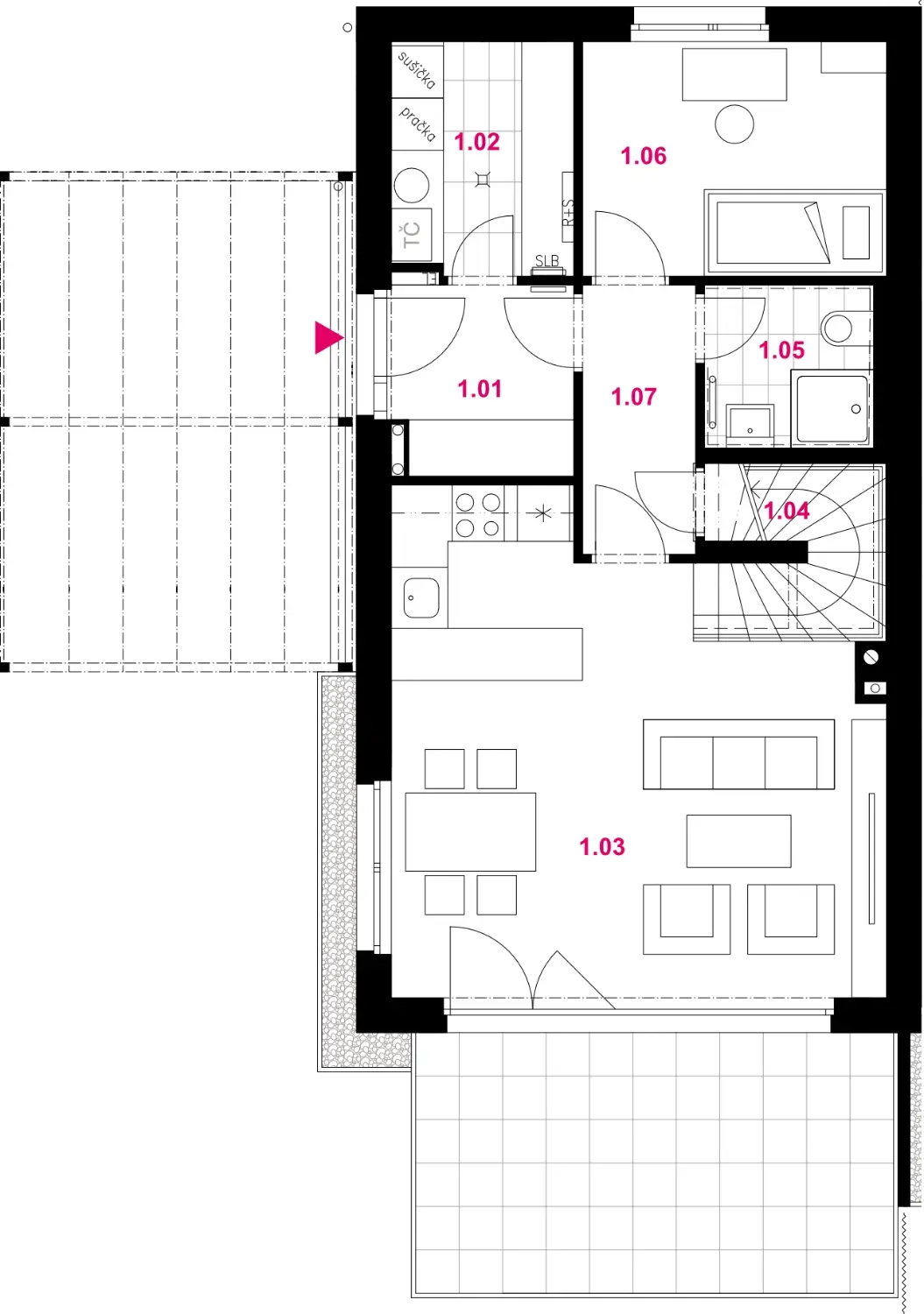 ** Plochy jednotlivých místností jsou pouze orientační. Vyobrazené zařízení v plánech domů (nábytek, kuch. linka, spotřebiče atd.) není součástí dodávky. Rozsah dodávky je specifikován ve standardu a finálně pak ve smlouvě. Grafické schéma je pouze ilustrativní.